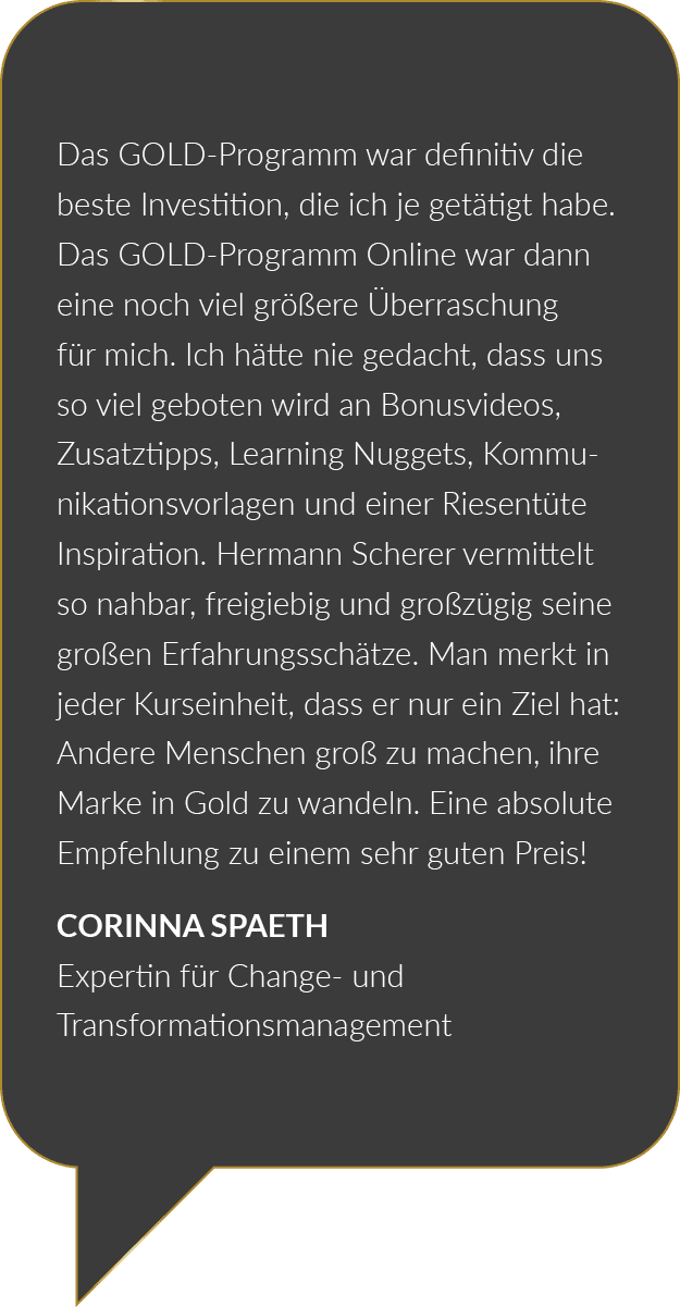 Du bist GOLD wert! Wir haben das GOLD-Programm und GOLD-Online entwickelt, um Dir eine Plattform für Deine persönliche und fachliche Weiterentwicklung zu geben. Gold gehört zu den Übergangsmetallen und auch wir wollen Dich bei einer wichtigen Transformation begleiten: